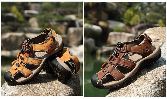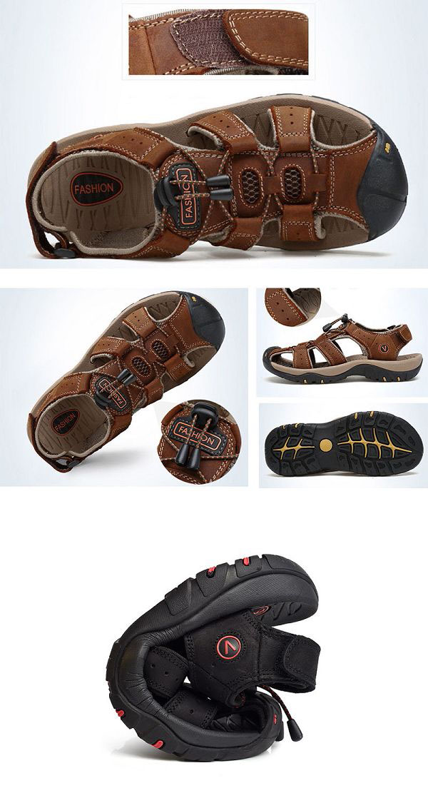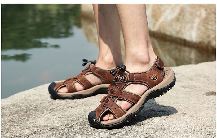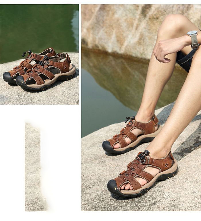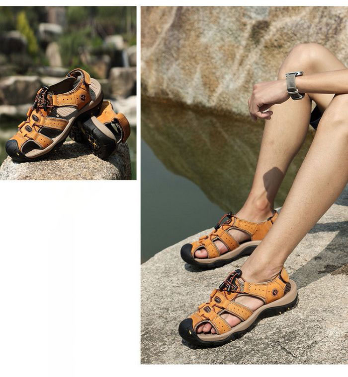 【足保護設計を採用】サンダルのつま先部分には保護設計を採用。牛革が足を包み込んでしっり支えて、足をしっかりと保護、ケガを防ぐ!