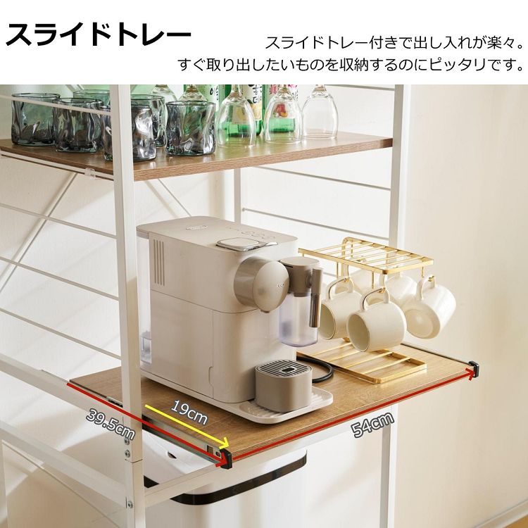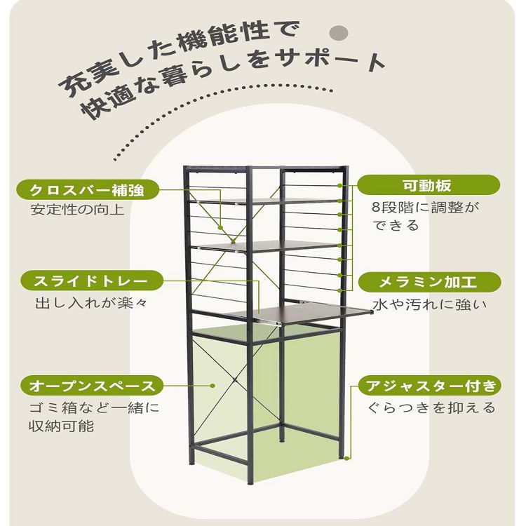 【充実した機能性で快適な暮らしをサポート】スライドトレー出し入れが楽々、可動板8段階に調整ができる、オープンスペースゴミ箱など一緒に収納可能、クロスバー補強安定性の向上、メラミン加工水や汚れに強い、アジャスター付きぐらつきを抑える