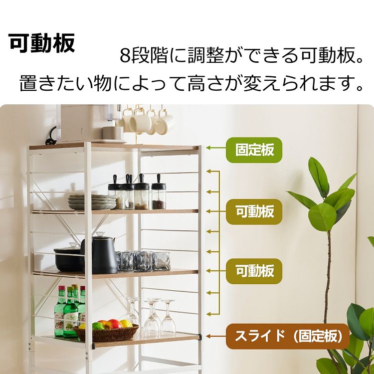 【収納物に合わせて調整できる可動棚】8段階に調整ができる可動板。置きたい物によって高さが変えられます。高さのある家電から背の低い食器まで、無駄を作らず収納可能です。