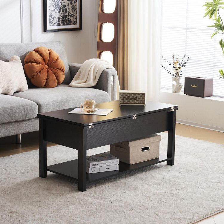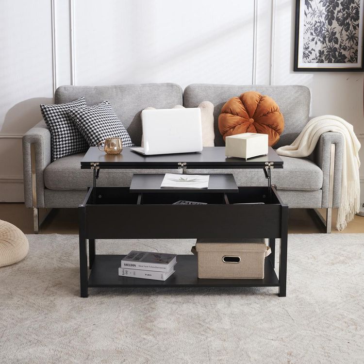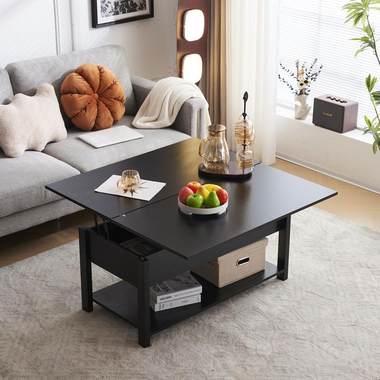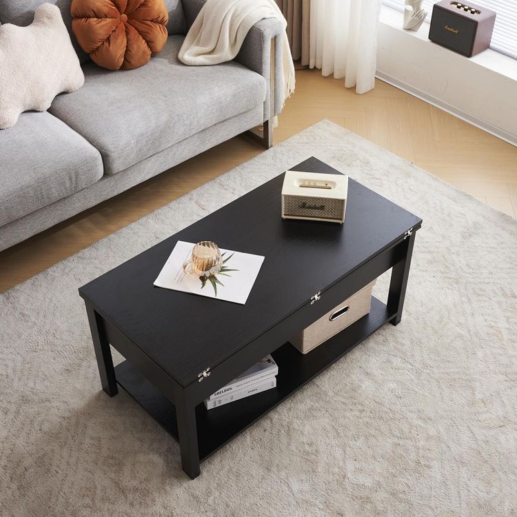 ローテーブル 収納付き センターテーブル 天板昇降式 天板2倍展開可能 大容量 簡単開閉 昇降式 収納テーブル おしゃ Black MDF
