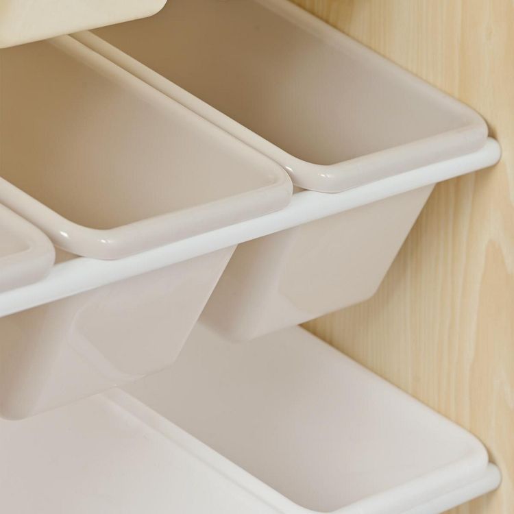 POINT 3 【なんでも収納できるカラフルBOX 】中段はカラフルBOXが九つあり、おもちゃやお服などすっきり収納できます。さらに、BOXは軽くて持ち運びしやすく、出し入れも便利で、お子供でも簡単に分別収納できます。