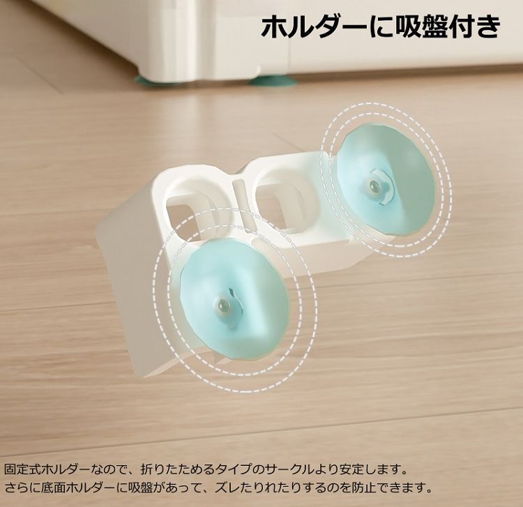 【固定ホルダー+吸盤付き 】固定式ホルダーなので、折りたためるタイプのサークルより随分安定します。さらに底面ホルダーに吸盤があって、サークルがズレたり倒れたりするのを防止できます