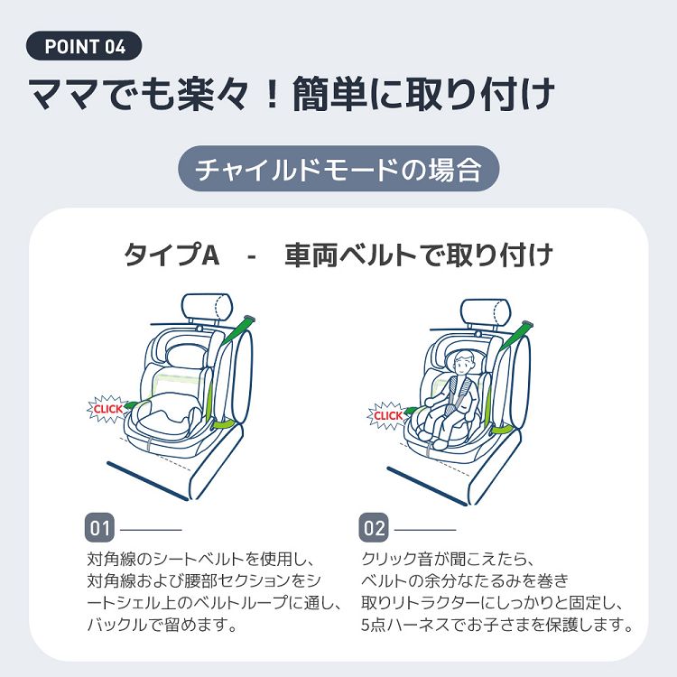クリック音が聞こえたら、ベルトの余分なたるみを巻き取りリトラクターにしっかりと固定し、5点ハーネスでお子さまを保護します。