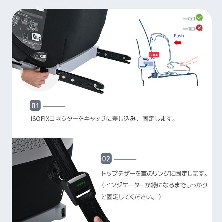 コネクタを差し込こんでトップテザーをセットするだけの簡単2ステップでらくらくに取り付けます。