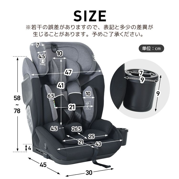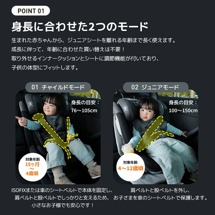 生まれた赤ちゃんから、ジュニアシートを離れる年齢まで長く使えます。