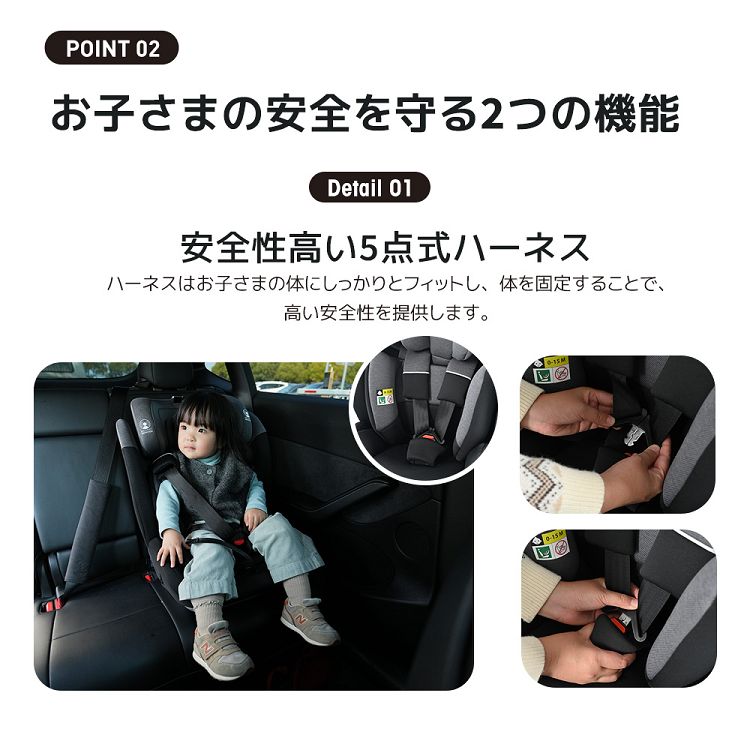 ハーネスはお子さまの体にしっかりとフィットし、体を固定することで、高い安全性を提供します。