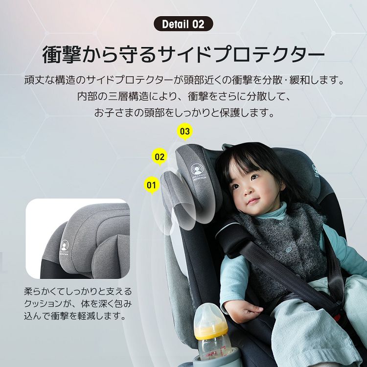 内部の三層構造により、衝撃をさらに分散して、お子さまの頭部をしっかりと保護します。