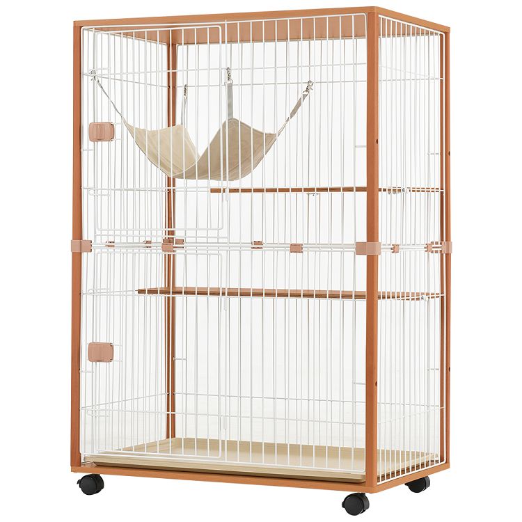 猫 キャットケージ 木製 キャットハウス ネコ ハウス 留守番 保護 脱走防止 多頭飼い 多頭 スチール 二段 Teak Wood + Stainless Steel
