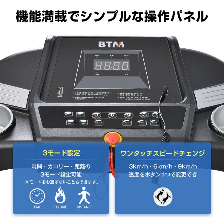 【多機能&見やすい操作パネル】走行時間・走行距離・消費カロリー・スピード・心拍数を確認できます。12種類プログラム、速度は0.8-12km/hの間に調整できます。3km/6km/9kmまで一気に速度切り替えワンタッチボタンも付き、速度調節便利です。