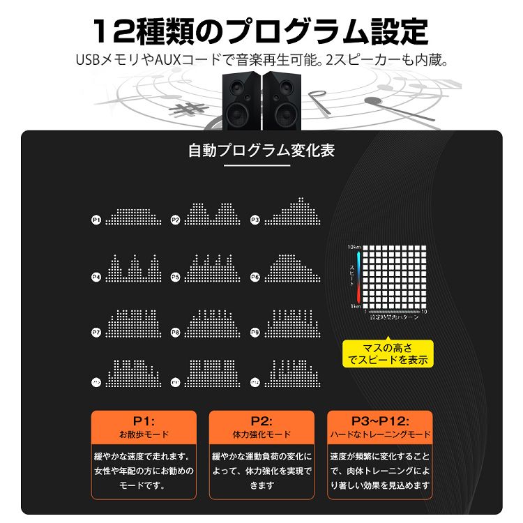 【高機能モーター&12種類プログラム】 折り畳み式のルームランナーには超静音設計のモーターを採用してお部屋に利用したら周りの方に邪魔する心配はありません。速度は0.8-12km/hの間に調節でき、12種類プログラムを搭載しており、自分に合ったプログラムを選んで散歩からランニングまで楽しめます。無理なく運動してより効率的に有酸素運動できます。このウォーキングマシン一台持てば家族で共有できる。