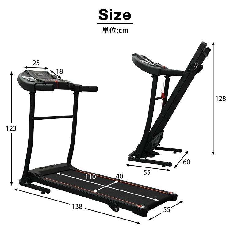 仕様 ●耐荷重:100kg ●速度:0.8km/h~12km ●静音 ●付属物:工具一式、安全キー、日本語説明書 ●電源:AC 100~110V 50~60Hz ●12種類ダイエットプログラム ●連続使用時間:1時間 ●※安全の為、アース線付きコンセントとなります。