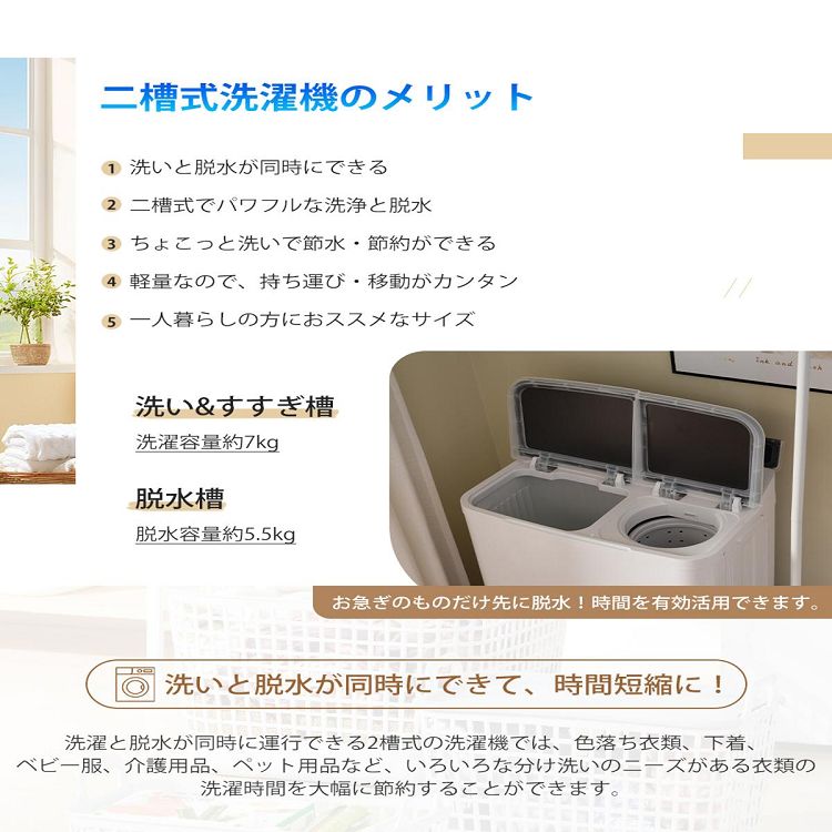 【新品】 2槽式洗濯機 洗濯槽7kg/脱水槽5.5kg 二槽式洗濯機 二層式洗濯機 2層式洗濯機 大容量 布団 節電 タイマー機能 水位調整 一人暮らし 家庭用 ホワイト