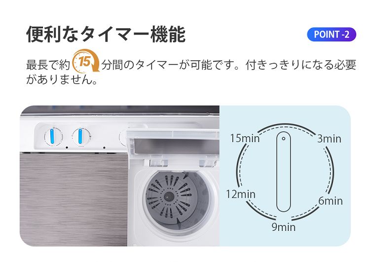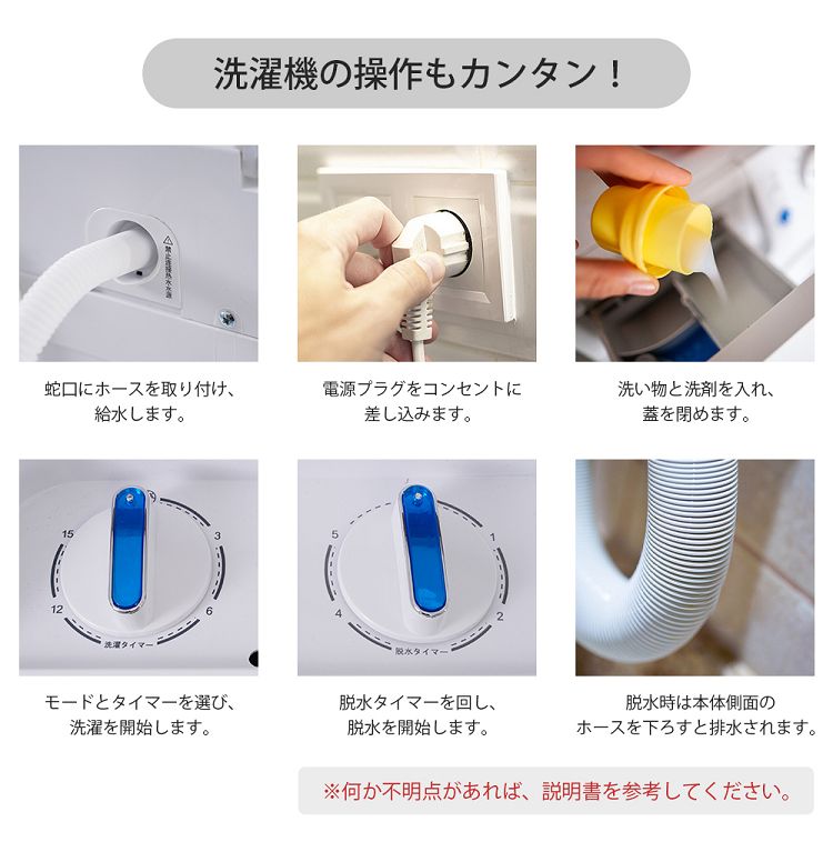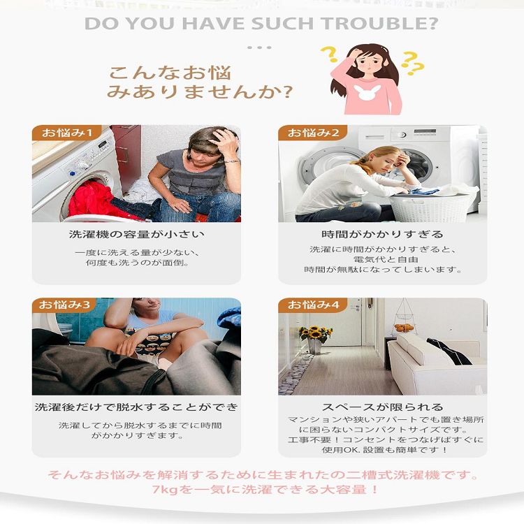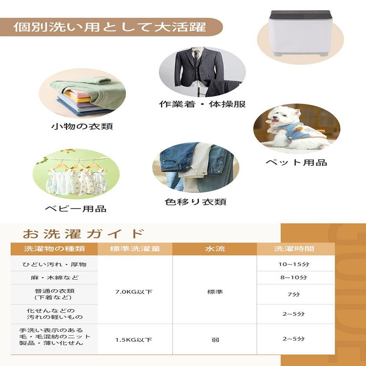 【2槽式で分け洗いに便利!洗濯時間を節約!】普通には、分け洗いの必要がある衣類の洗濯は非常に時間がかかるではないでしょうか。洗濯と脱水が同時に運行できる二槽式の洗濯機で、色落ち衣類、下着、ベビー服、介護用品、ペット用品など、いろいろな分け洗いの洗濯時間を大幅に節約することができます。
