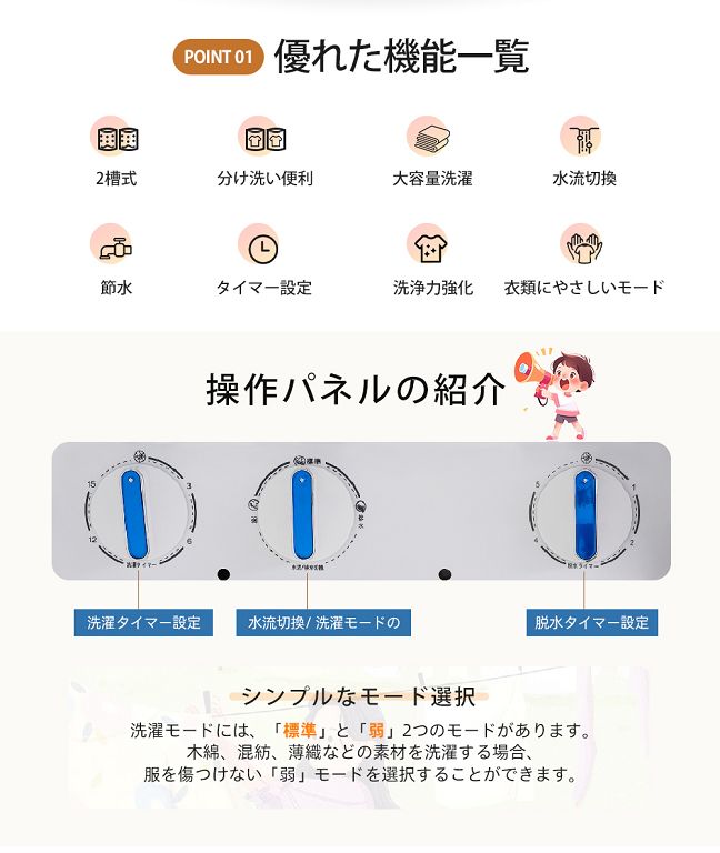 【洗濯量に応じて水流・水位のご自由な調整で光熱費を節約】何枚だけの服を洗濯したい時に、水流・水位と洗濯時間を選べないと、水や電がもったいないでしょう。本品は、洗濯物の量に応じて、ご自由に水流・水位と洗濯タイマーを設定することができます。ニーズだけの水と電を消耗するので、水と電気の無駄にならなく、光熱費も大幅に節約することができます。
