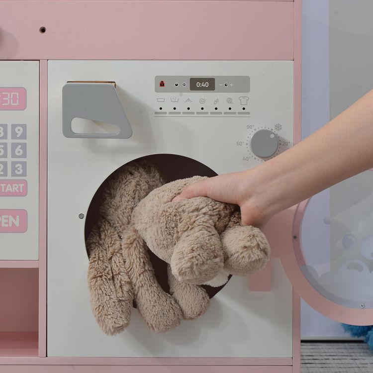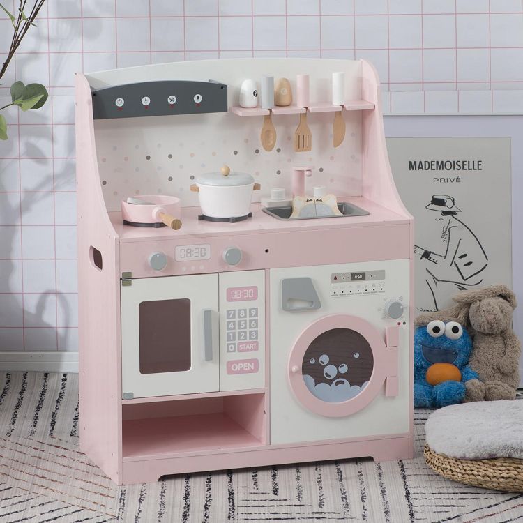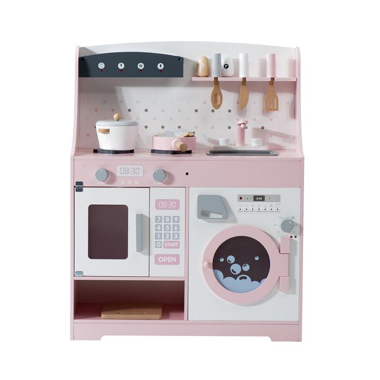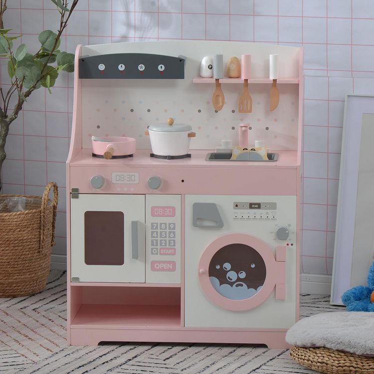 おままごと キッチン 木製 誕生日 台所 洗濯機 調理器具付き 調味料 食材 知育玩具 おもちゃキッチン キッズ ベビー Pink MDF