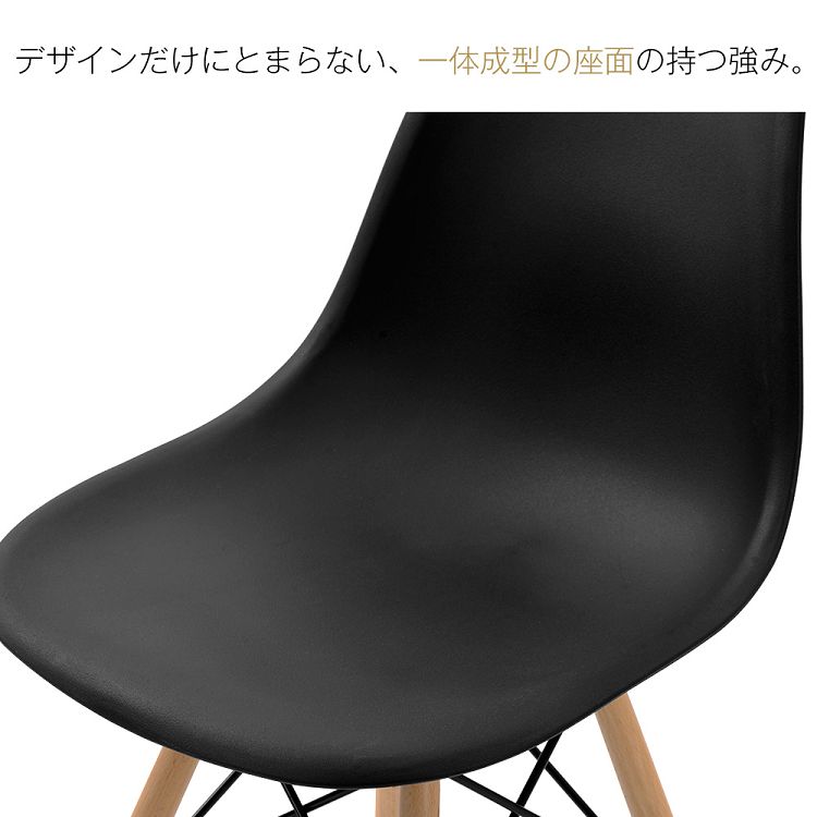 【身体に自然とフィットするシェル型座面】イームズチェア最大の魅力は、何と言ってもなめらかな曲線を描く、座面一体のシェル型デザインです。ポップな印象のシェル型座面は、想像以上のフィット感で腰を優しく包み込みます。身体に馴染む座り心地は長年愛されてきたチェアならではです。