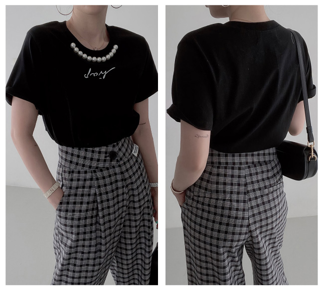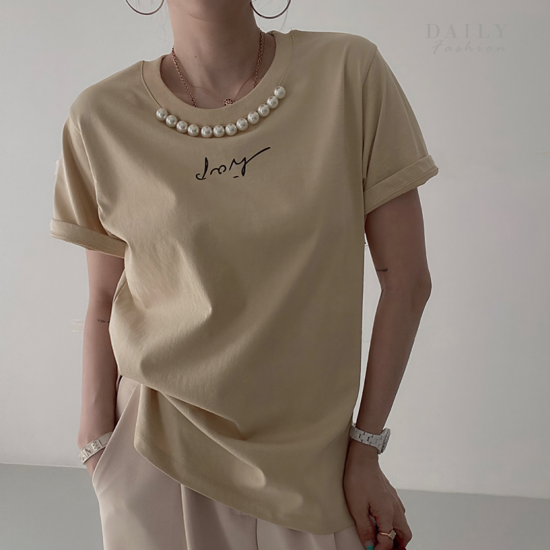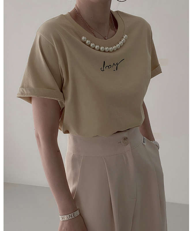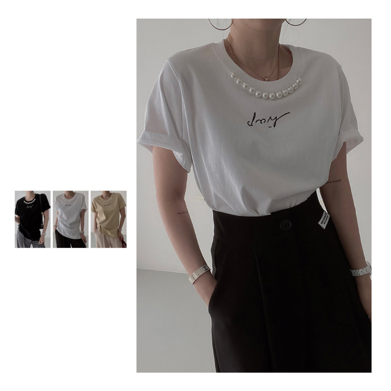 上品な着こなしが決まる、ネックラインにパールが施された半袖ロゴTシャツ。