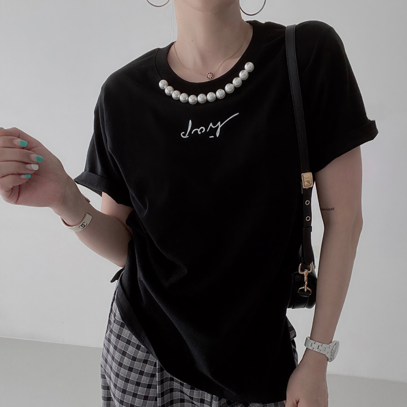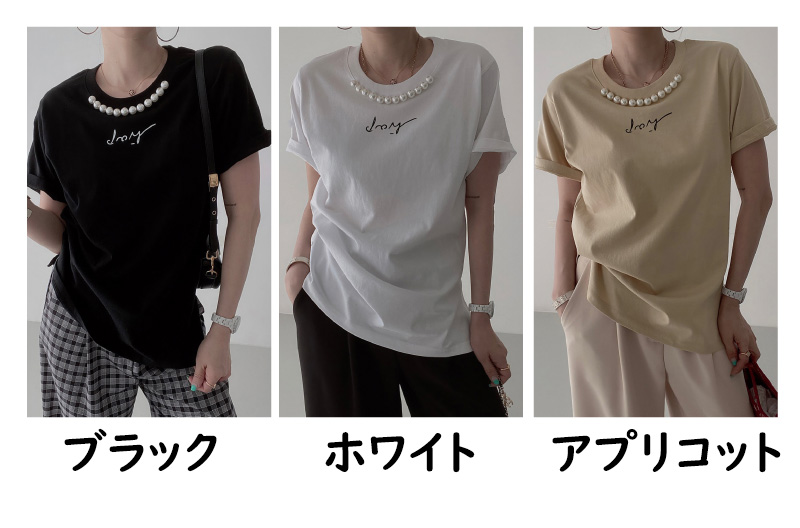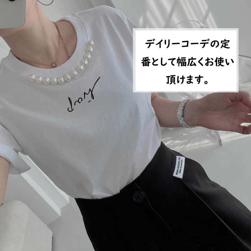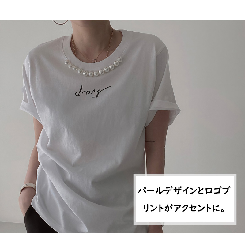 レディース Tシャツ 半袖 トップス パールデザイン おしゃれ ロゴ ロゴT プリント ブラック ホワイト 春 夏 ラウンドネック インナー ウェア カットソー 大人 可愛い コーデ