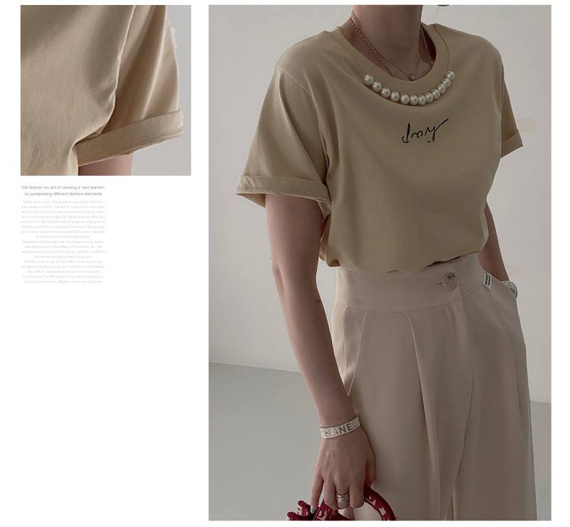 品説明 上品な着こなしが決まる、ネックラインにパールが施された半袖ロゴTシャツ。