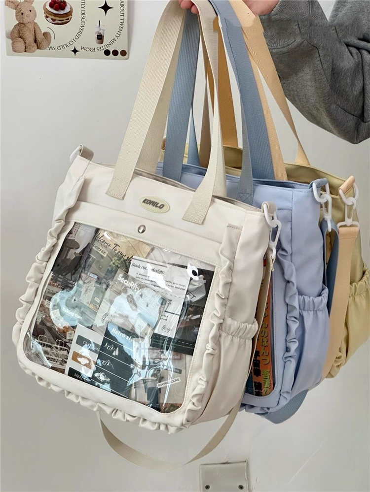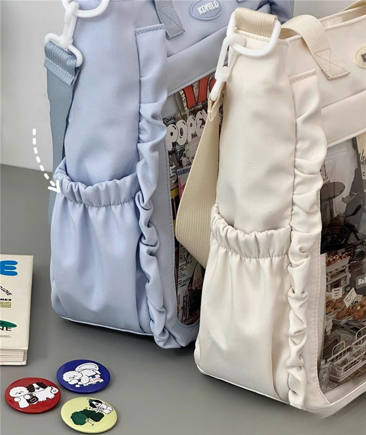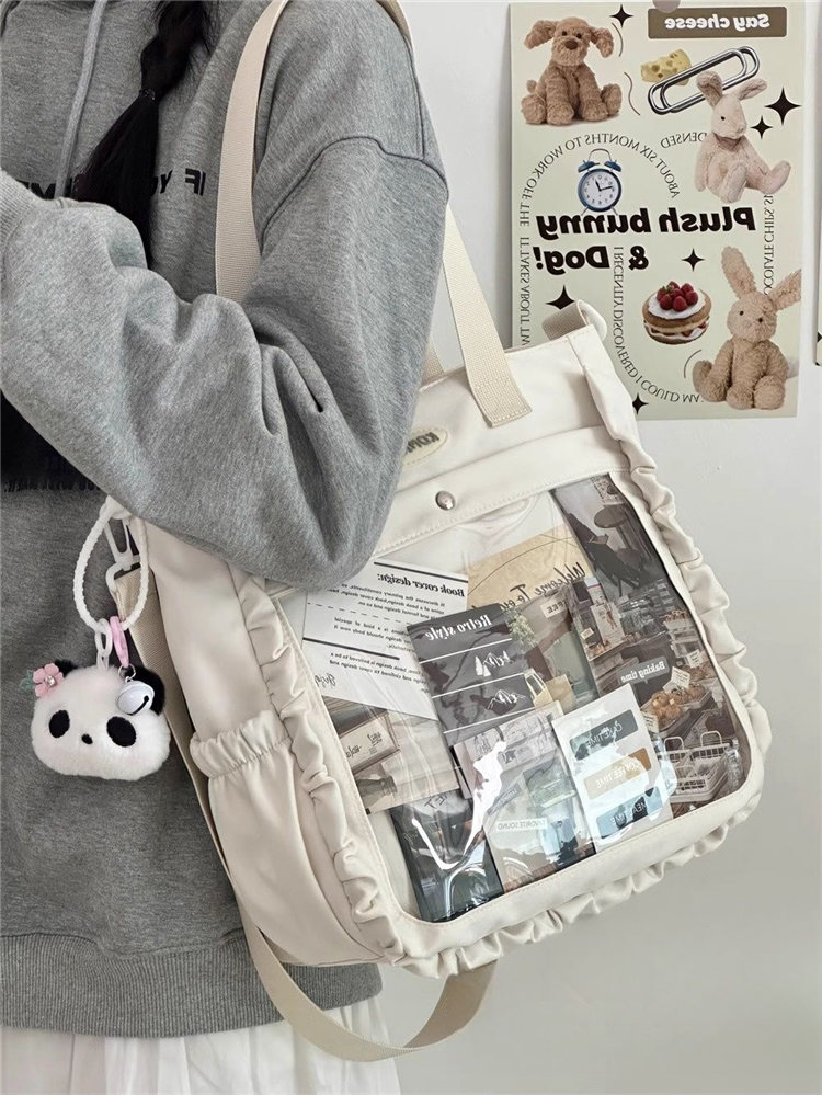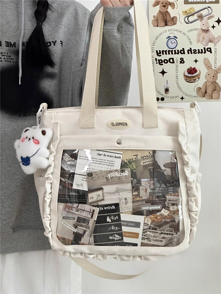 前の透明ポケット付きで、自分の好きな小物を入れることができるバッグです。 好きな芸能人や、アニメの写真 、缶バッジ、ストラップ、キーホルダーなどを入れるだけで、簡単に世界で1つたったのオリジナルバッグの完成です、毎日楽しく使える。