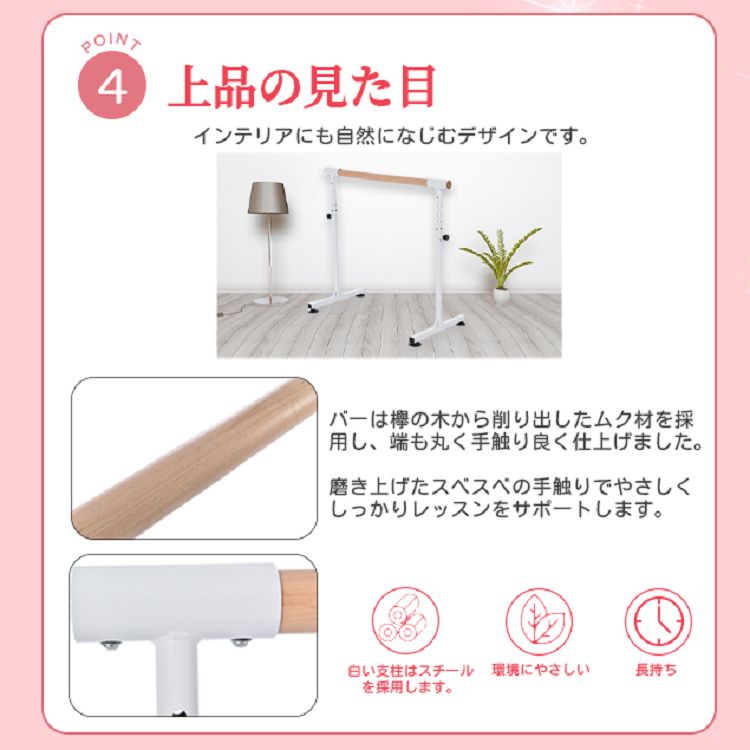 【上品の見た目】バーは欅の木から削り出したムク材を採用し、端も丸く手触り良く仕上げました。 磨き上げたスベスベの手触りでやさしくしっかりレッスンをサポートします。 白い支柱はスチールを採用します。 環境にやさしい