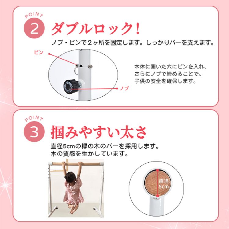【ダブルロック!】ノブ・ピンで2ヶ所を固定します。しっかりバーを支えます。 本体に開いた穴にピンを入れ、さらにノブで締めることで、子供の安全を確保します。