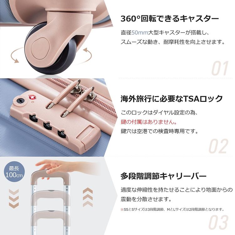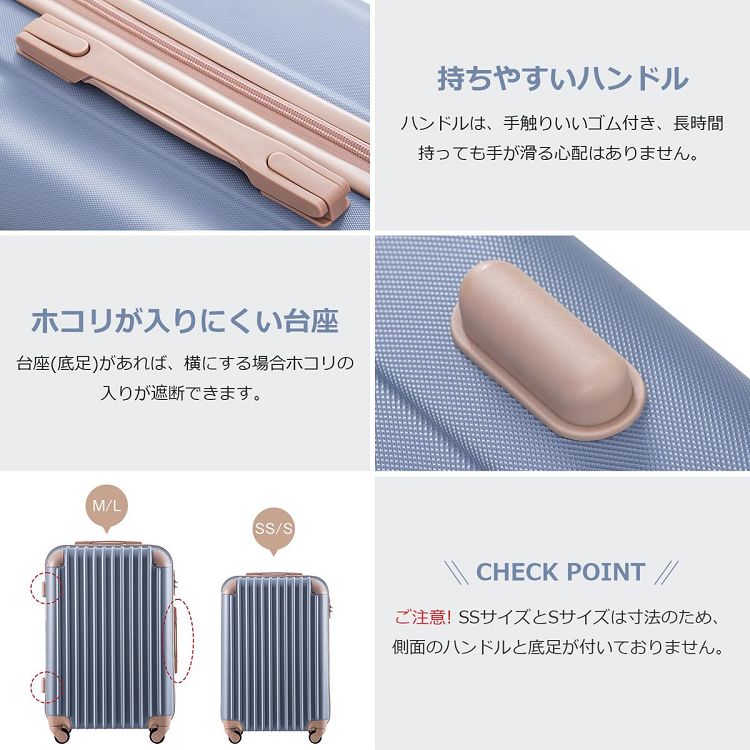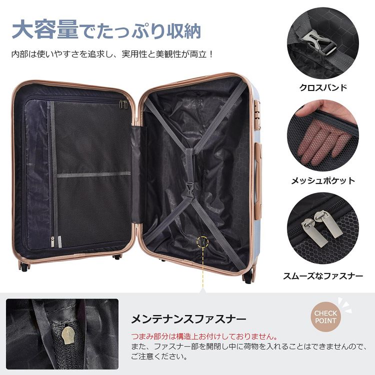 - 【超軽量】女性でも軽々と持ち上げることができる驚きの軽さ。軽量だから階段もラクラク。女性の方でもらくらく。旅先で重い荷物を持っての移動や、階段の上り下りはシア宮内ですよね。そこで一般的な同サイズの中でも、重量の軽いスーツケースを作りました。軽量スーツケースは海外旅行の、重さ制限にも有利。