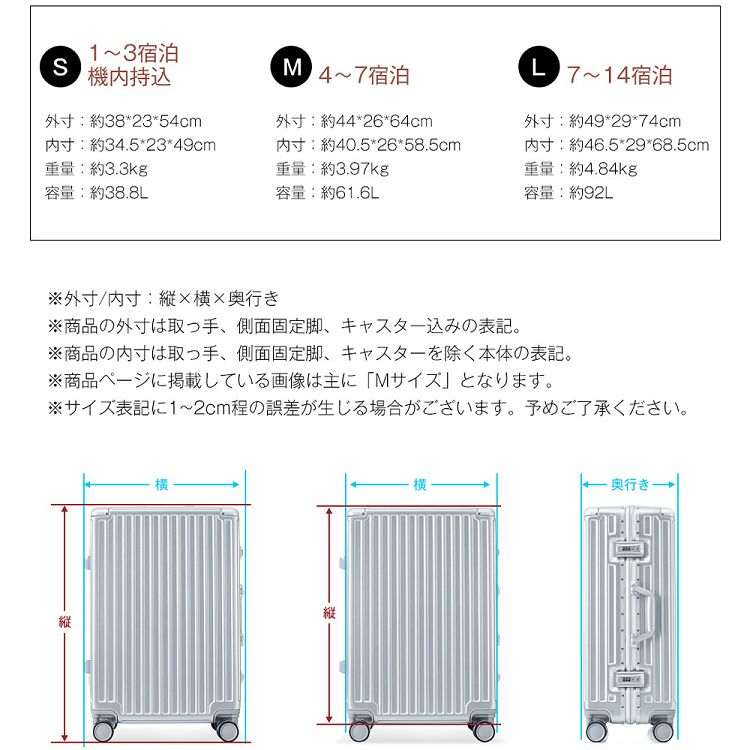 【Lサイズ 8-14日宿泊】外寸:約744929cm 内寸:約68.546.529cm 重量:約4.84kg 容量:約92L