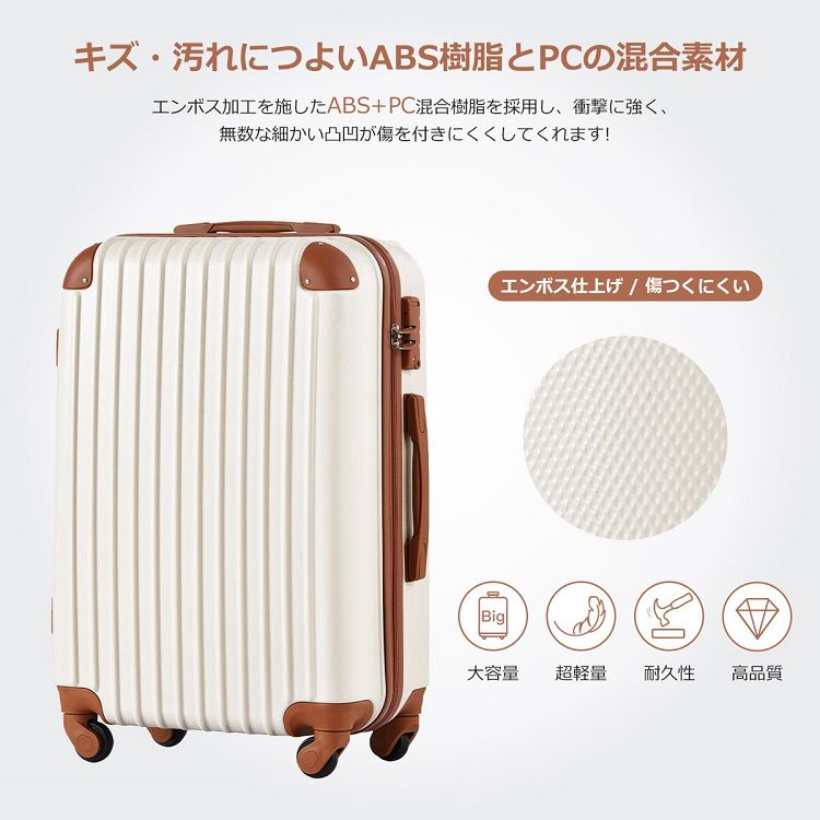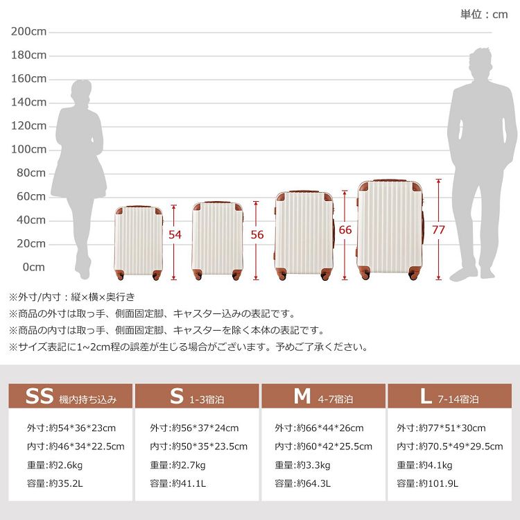 - 【超軽量】女性でも軽々と持ち上げることができる驚きの軽さ。軽量だから階段もラクラク。女性の方でもらくらく。旅先で重い荷物を持っての移動や、階段の上り下りはシア宮内ですよね。そこで一般的な同サイズの中でも、重量の軽いスーツケースを作りました。軽量スーツケースは海外旅行の、重さ制限にも有利。