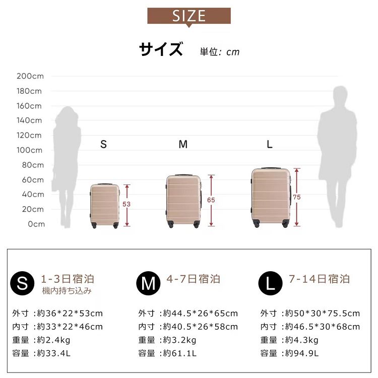 【M 4~7日宿泊】外寸:約6544.526cm 内寸:約5840.526cm 重量:約3.2kg 容量:約61.1L
