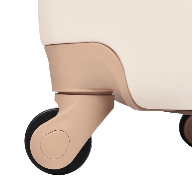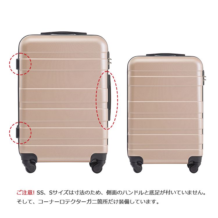 POINT 7.【 底足つき】横置きにも安心できるように底足つき横置き時にもスーツケースと地面の摩擦を避けるために、ケース中心部に底足を取付けました。ご注意:SS、Sサイズは寸法のため、側面のハンドルと底足が付いていません。予めご了承ください。