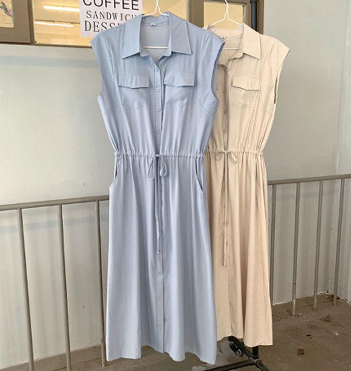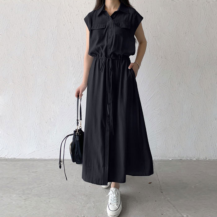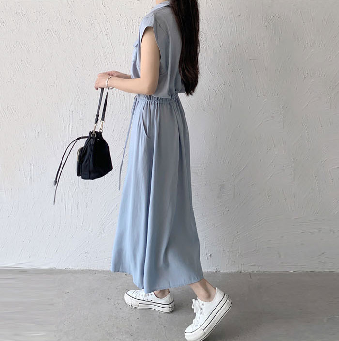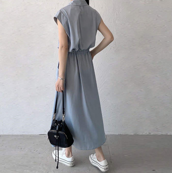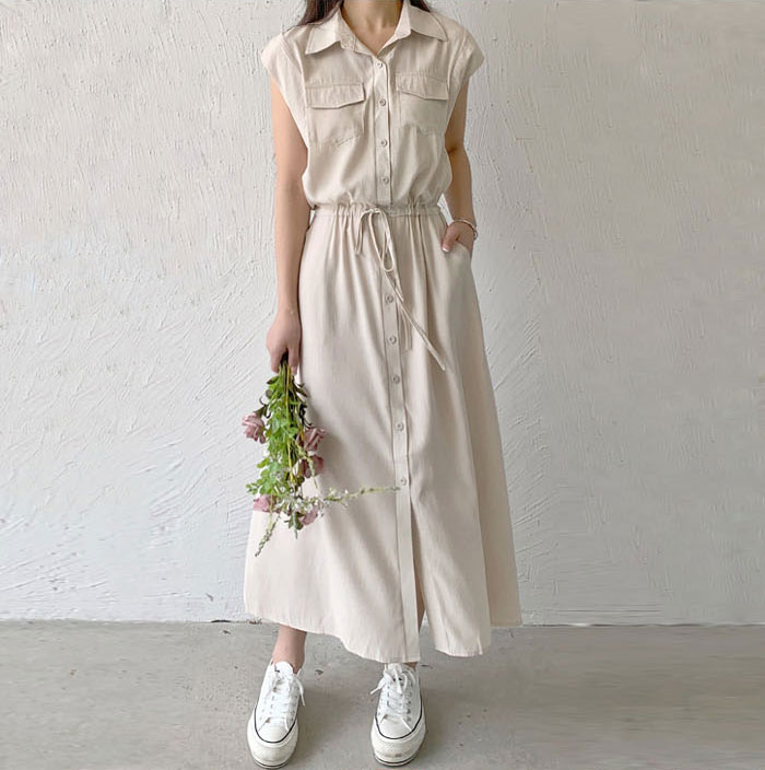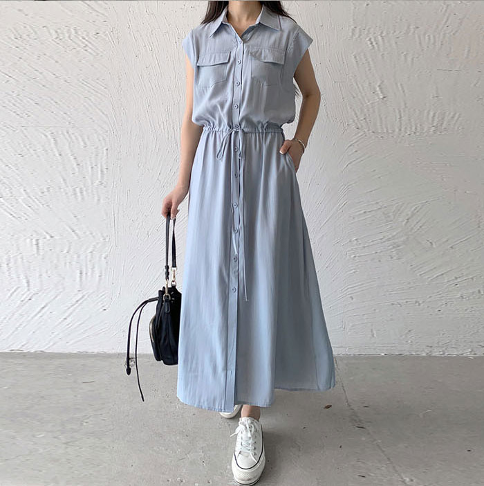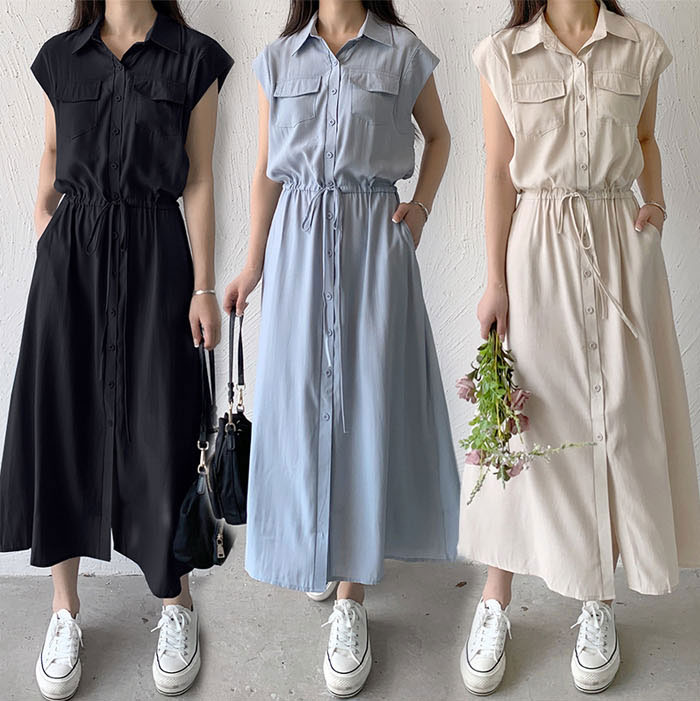 レディース ロングワンピース ミモレ丈ワンピース 襟付き ノースリーブ ワンピース 夏 きれいめ シャツワンピース 楽ちん 体型カバー ロング 上品 フレンチスリーブ 大人可愛い 綿混 ゆったり シンプル 無地 カジュアル デイリー 送料無料