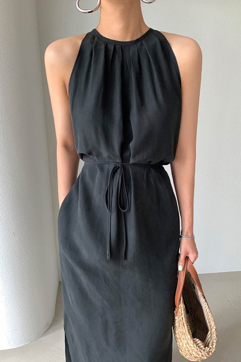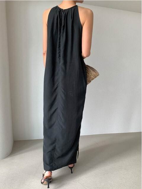 ワンピース レディース ノースリーブ ワンピドレス キャミワンピ 細身 ストレート サイドスリット 個性的 春 夏 ロング丈 アンクル丈 お尻カバー ポッコリお腹カバー 袖なし 腕出し Iライン スマート ポケット 落ち感 肩だし