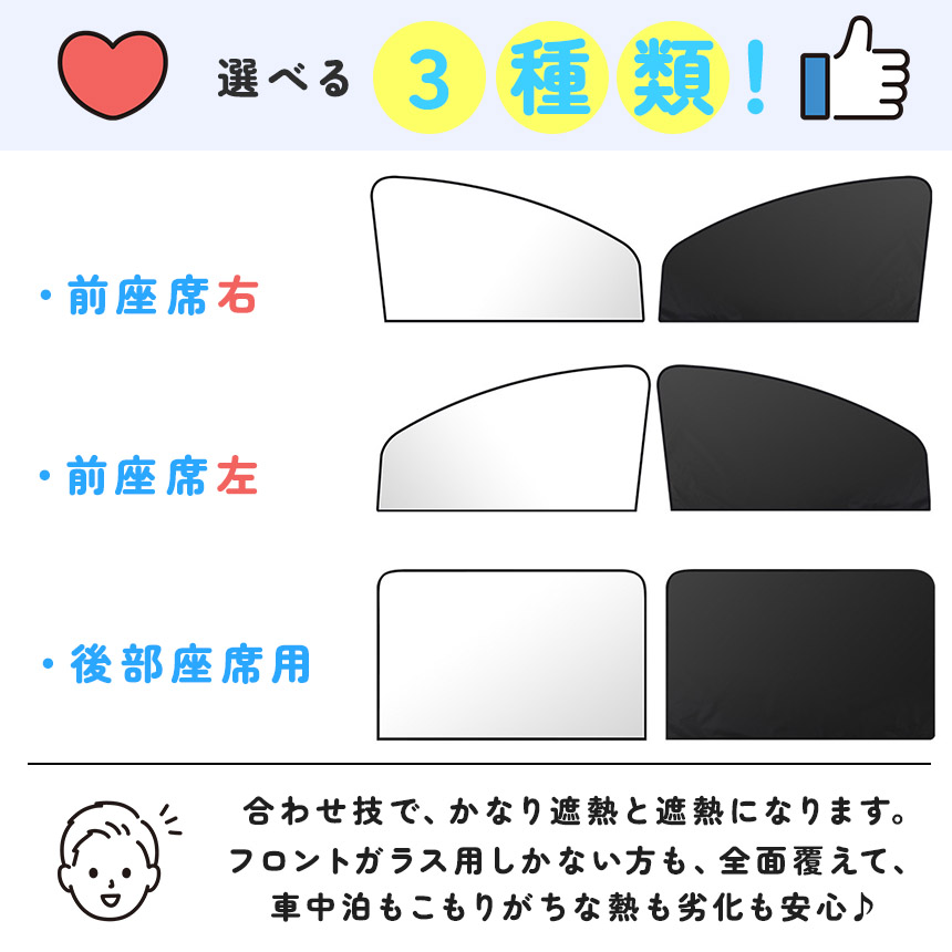 前座席右、前座席左、後部座席の3種類!後部座席用は左右対称でどちらにも使えます。