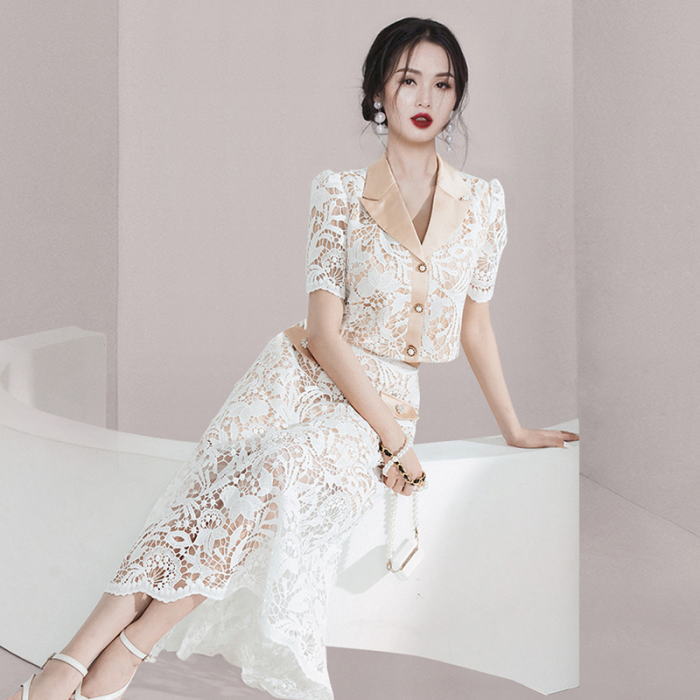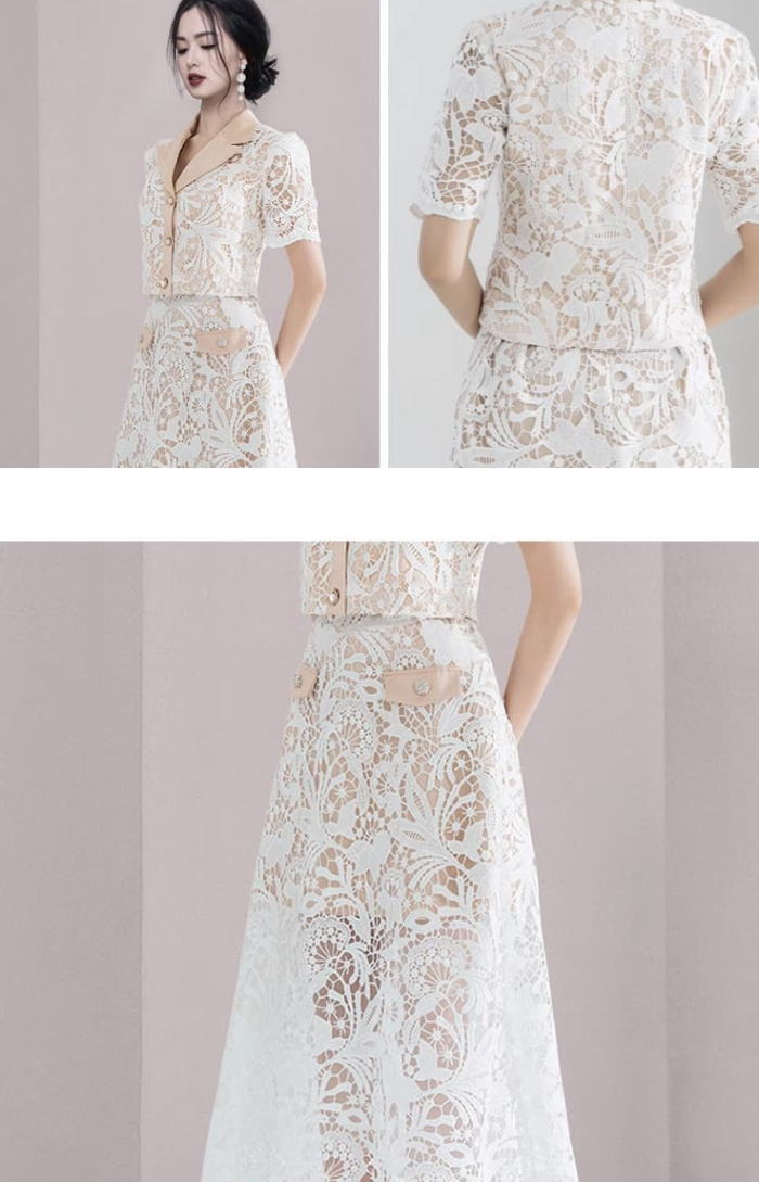トップス フレア ロング スカート スカートセットアップ テーラードカラー 総レース 半袖 スーツ ホワイト 白 ベージュ 生成 レディース セットアップ 大人 お嬢様 きれいめ 大きいサイズ 上品