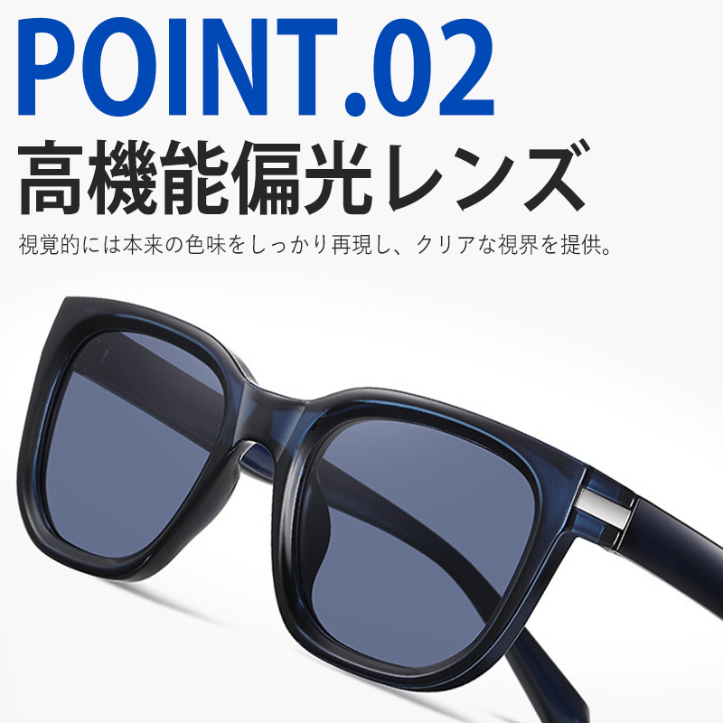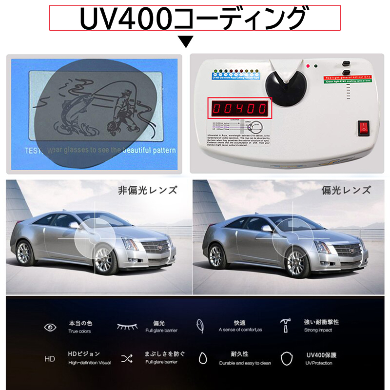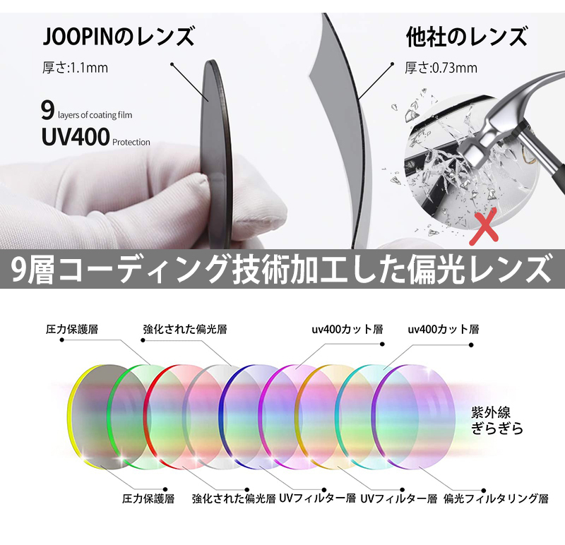 UV400保護コーティングにより、有害なUVAおよびUVB光線を効果的にブロックします。多様な素材を用いた9層構造の偏光レンズです。視覚的には本来の色味をしっかり再現し、光の反射や散乱を除去します。HD TAC偏光トリアセテートレンズは衝撃や擦れに強く、頑丈です!