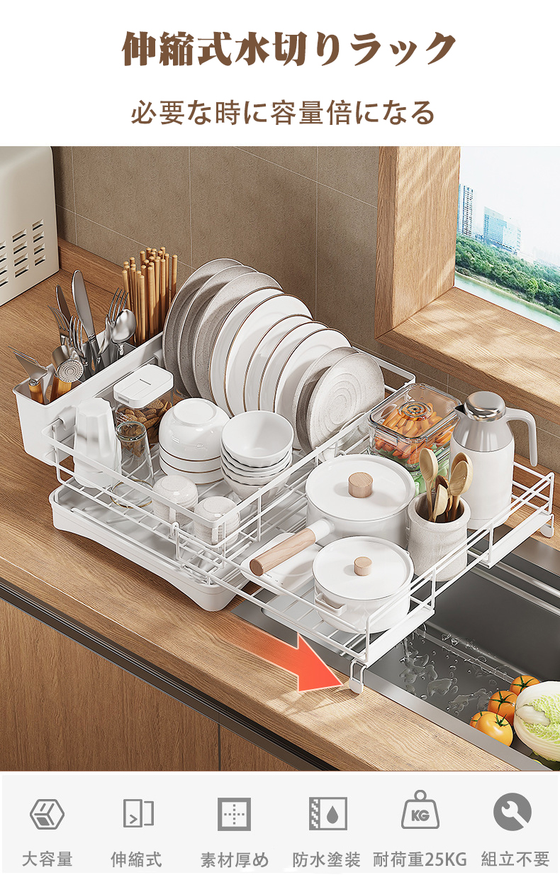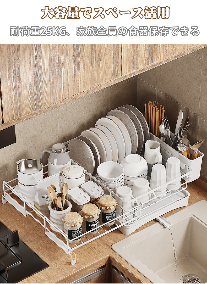 水切りラック 伸縮式 大容量 スリム おしゃれ ラック 水切りバスケット 収納 伸縮 排水トレー 水切りかご キッチン 省スペース 水切りトレー シンプル 家族 箸立て 水が流れる キッチン用品 横置き 乾燥 ステンレス シンク上 かご 皿立て