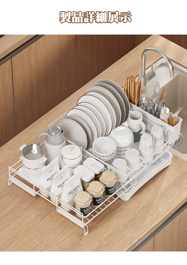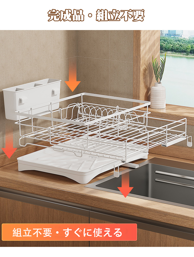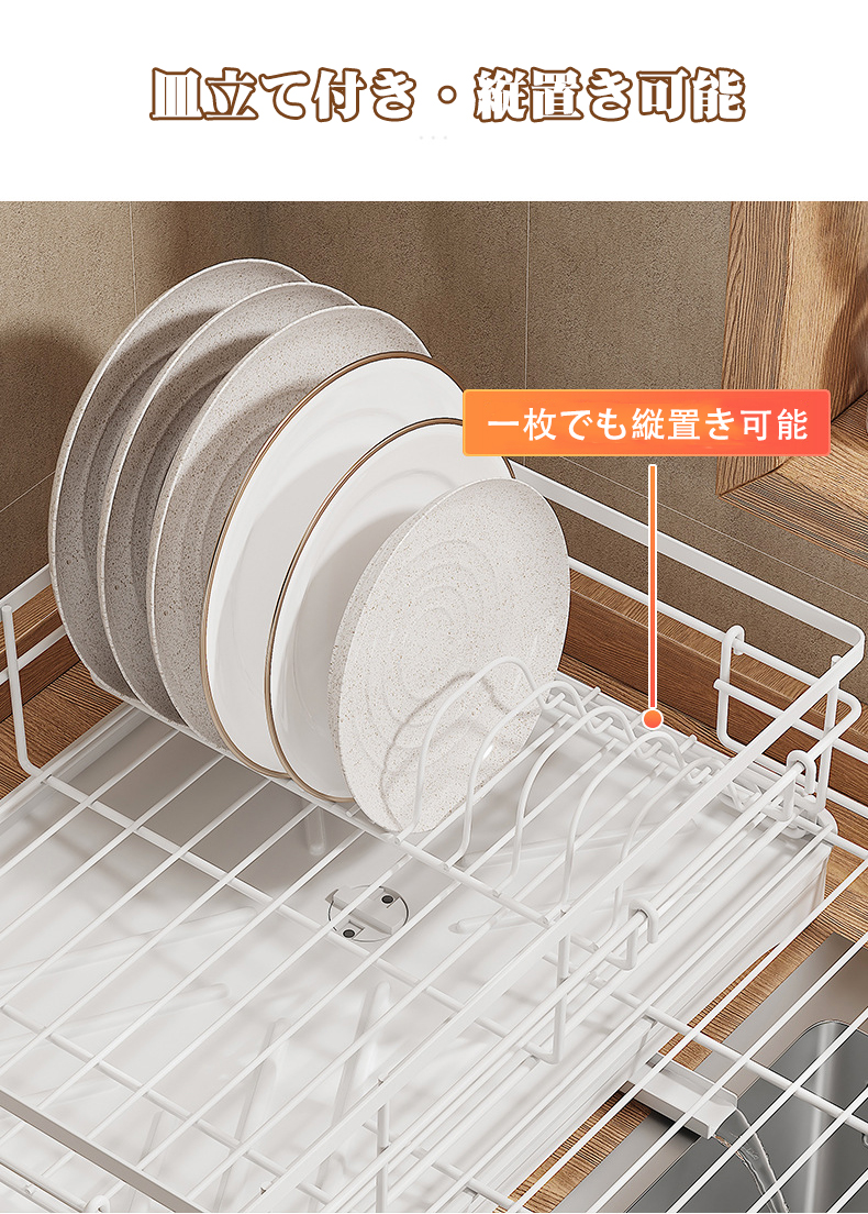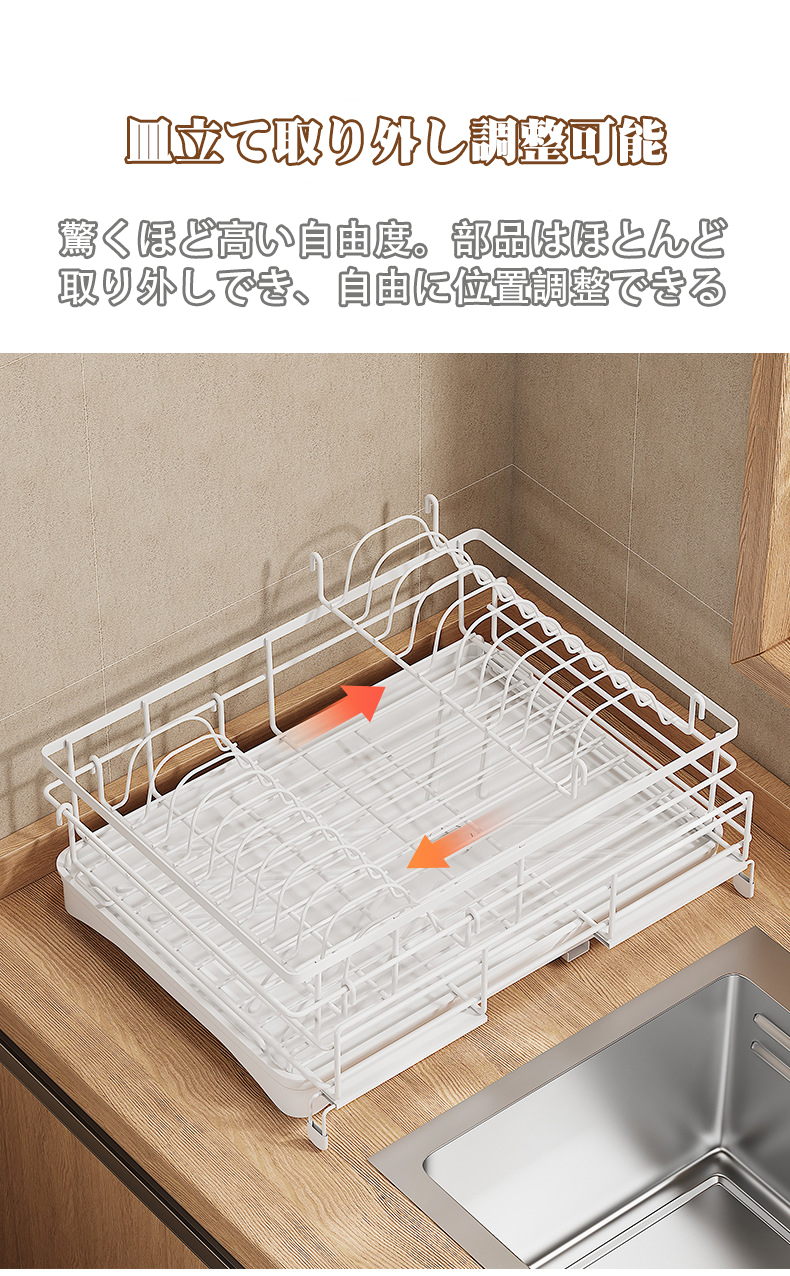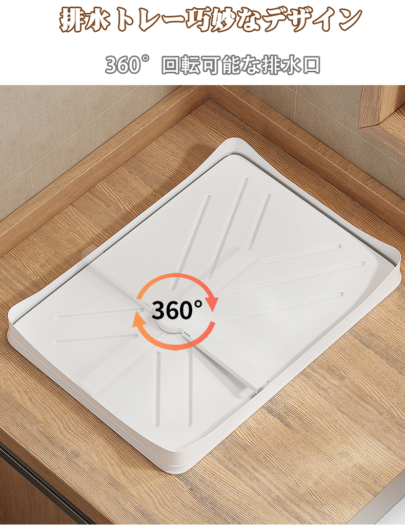 【排水トレー付き】本製品は水切り作業を簡単にし、キッチンを清潔に保ちます。水が自然と集まって、効果的に排出できて、カビや雑菌の発生を防ぎます。そして、排水口が伸長や360°回転可能で、どんな方向でもシンクに排水できます。