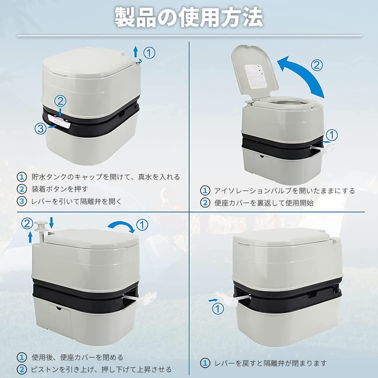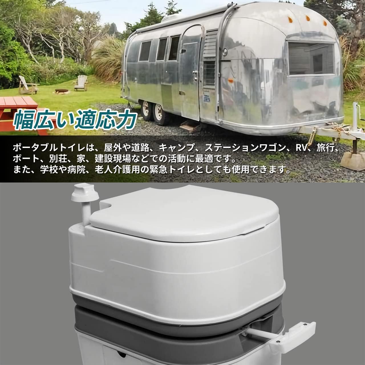 ポータブルトイレは、屋外や道路、キャンプ、ステーションワゴン、RV、旅行、ボート、別荘、家、建設現場などでの活動に最適です。また、学校や病院、老人介護用の緊急トイレとしても使用できます。