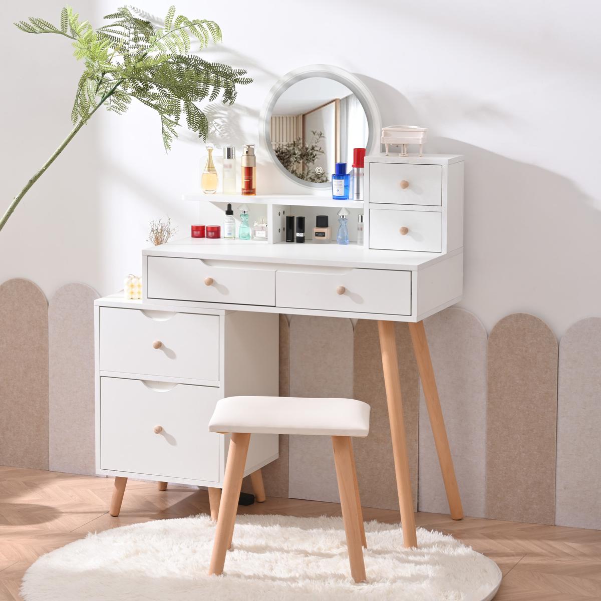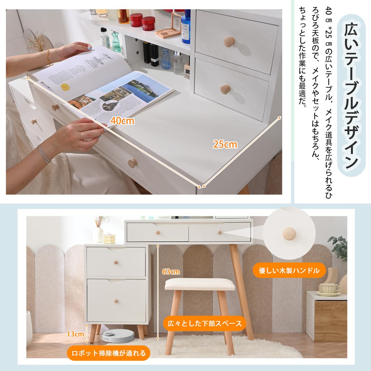 ドレッサー化粧台 テーブル 鏡台 LEDライト付き スツール付き 引き出し 収納 サイド収納 メイク台 シンプル 大容量 可愛い White Solid Wood