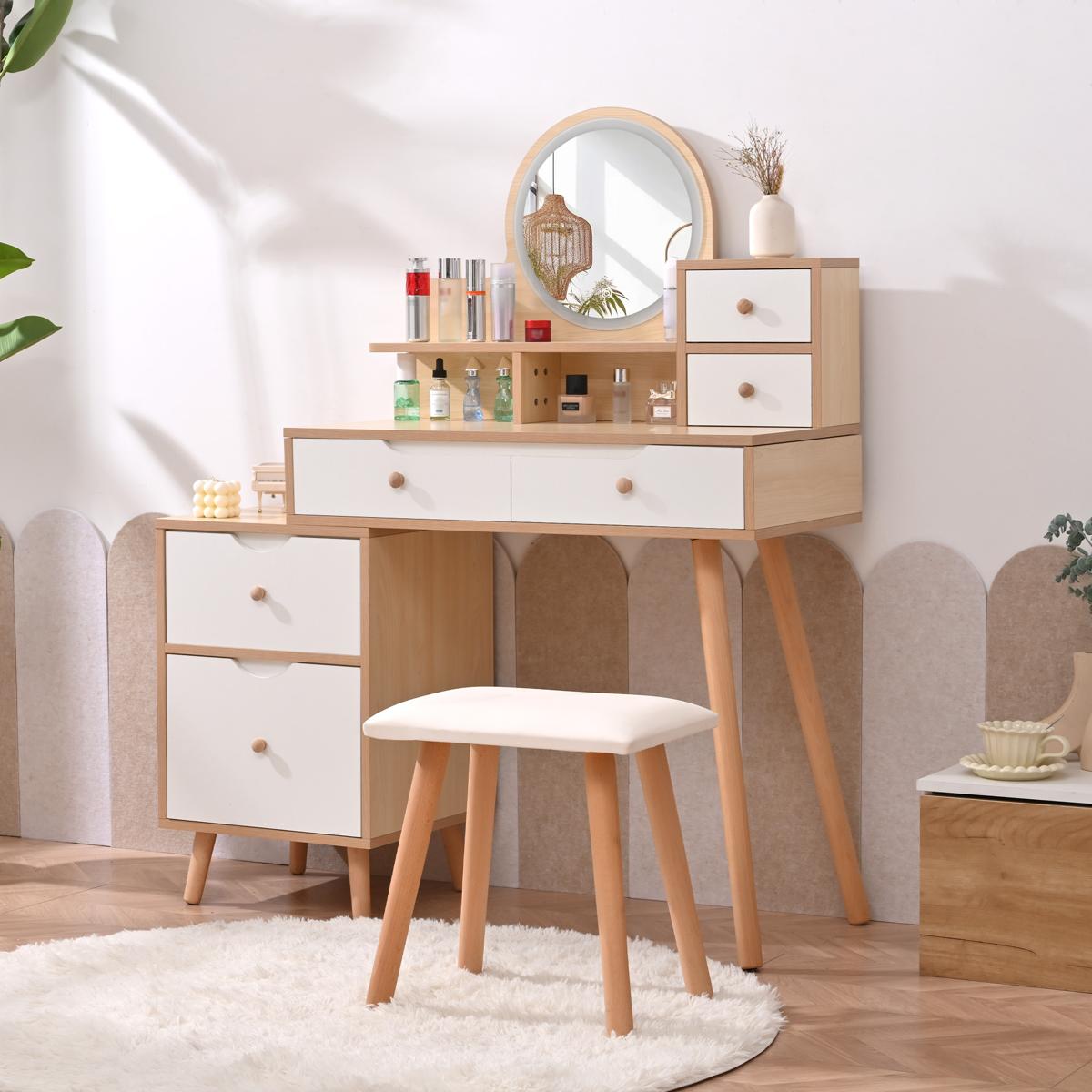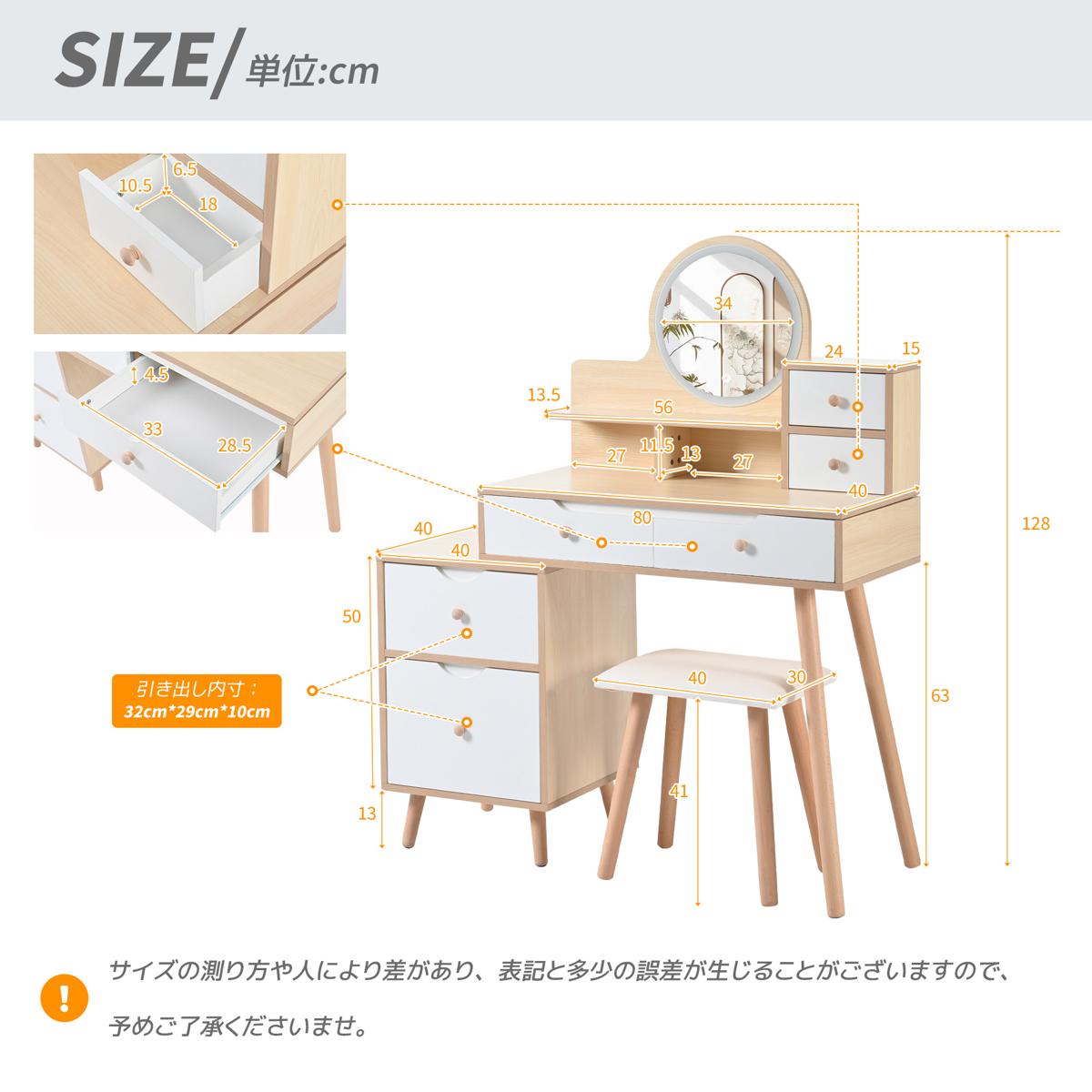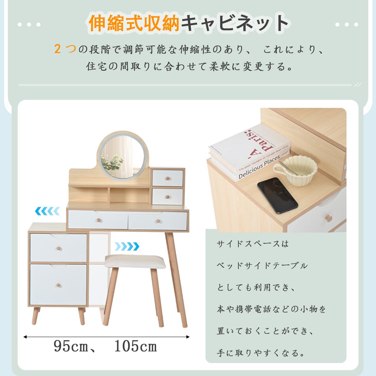 ドレッサー化粧台 テーブル 鏡台 LEDライト付き スツール付き 引き出し 収納 サイド収納 メイク台 シンプル 大容量 可愛い Natural Solid Wood