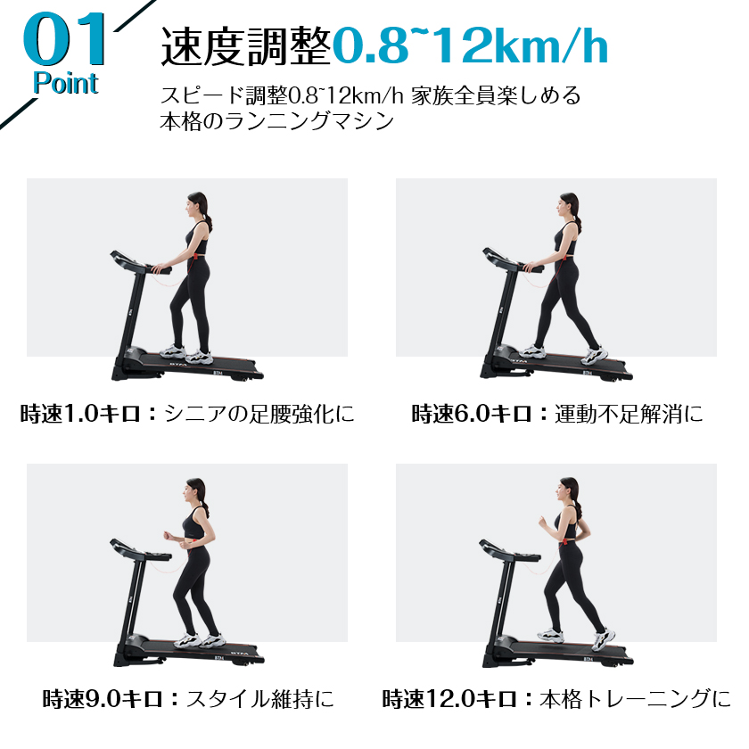 【速度調整0.8~12km/h】スピード調整0.8~12km/h 家族全員楽しめる本格のランニングマシン 時速1.0キロ:シニアの足腰強化に 時速6.0キロ:運動不足解消に 時速9.0キロ:スタイル維持に 時速12.0キロ:本格トレーニングに