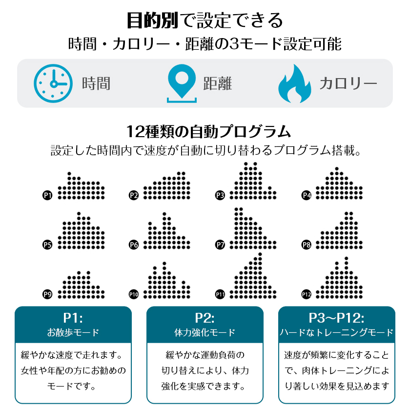【12種類の自動プログラム】設定した時間内で速度が自動に切り替わるプログラム搭載。 マスの高さでスピードを表示 P1:お散歩モード 緩やかな速度で走れます。女性や年配の方にお勧めのモードです。 P2:体力強化モード 緩やかな運動負荷の切り替えにより、体力強化を実感できます。 P3~P12:ハードなトレーニングモード 速度が頻繁に変化することで、肉体トレーニングにより著しい効果を見込めます。