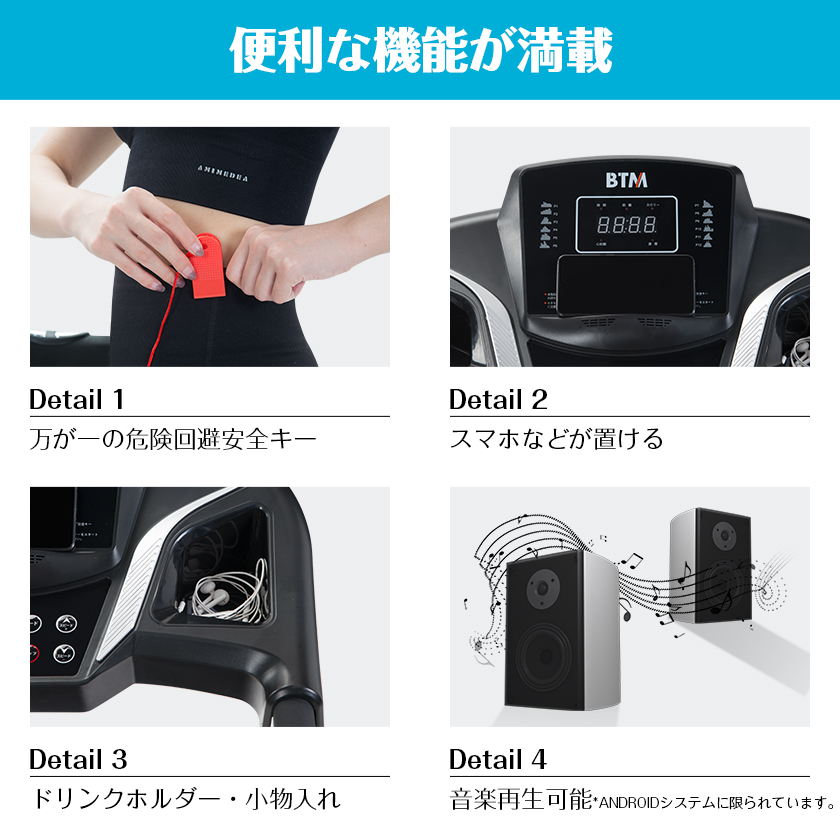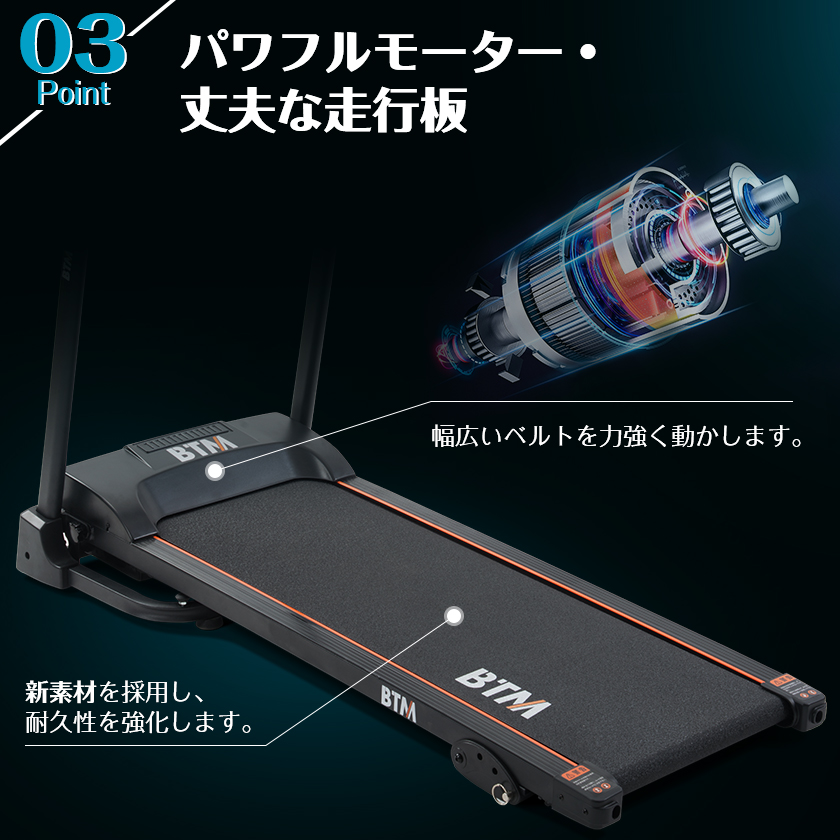 【パワフルモーター・丈夫な走行板】幅広いベルトを力強く動かします。 新素材を採用し、耐久性を強化します。