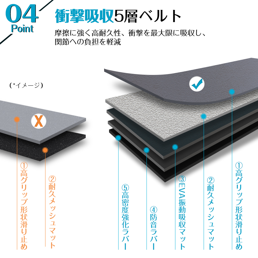 【衝撃吸収 5層ベルト】摩擦に強く高耐久性、衝撃を最大限に吸収し、関節への負担を軽減 ① 高グリップ形状滑り止め ② 耐久メッシュマット ③ EVA振動吸収マット ④ 防音ラバー ⑤ 高密度強化ラバー
