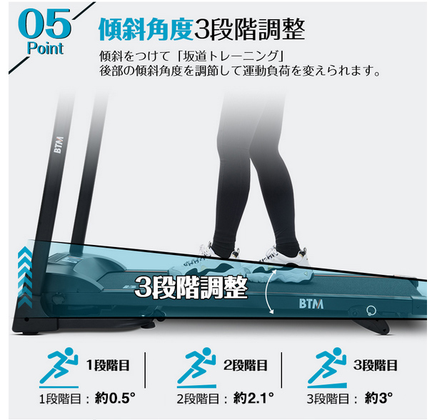 【傾斜角度3段階調整】傾斜をつけて「坂道トレーニング」 後部の傾斜角度を調節して運動負荷を変えられます。