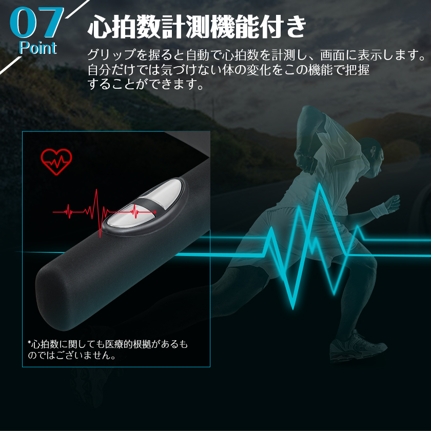 【心拍数計測機能付き】グリップを握ると自動で心拍数を計測し、画面に表示します。 自分だけでは気づけない体の変化をこの機能で把握することができます。