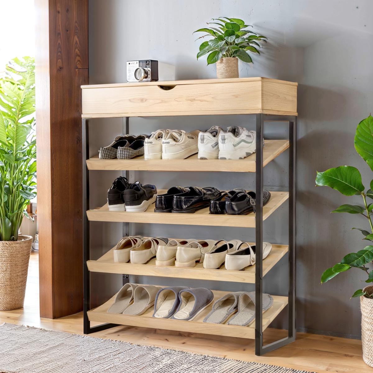【シューズラック 省スペース】スリムなので、限られたスペースの玄関でも、空間を圧迫せずにたくさんの靴を収納できます。靴を収納するという役割に加え、玄関周りを温もり感じるお洒落な空間に彩って頂けます。