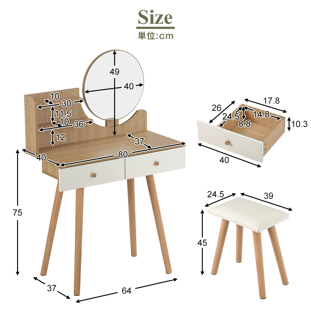 天板は幅80CM奥40CMと、スペースを取りすぎないスリムさ 化粧品からアクセサリーまでしっかり置くことができます。