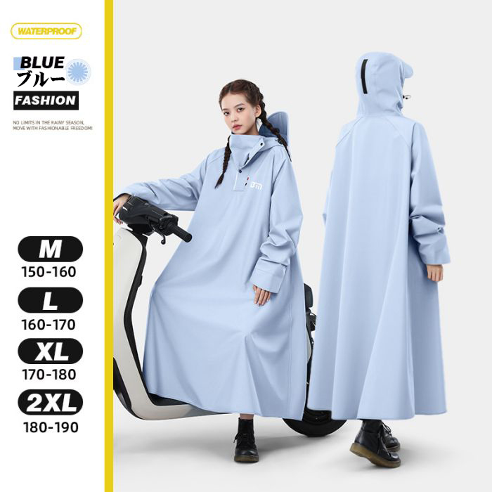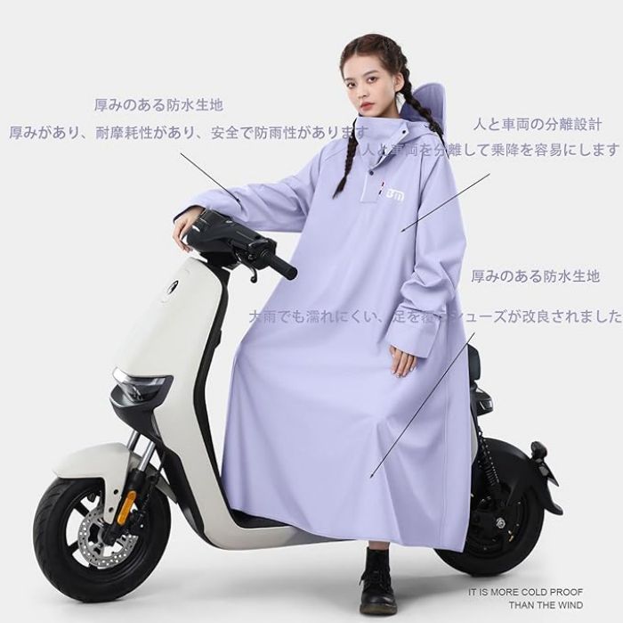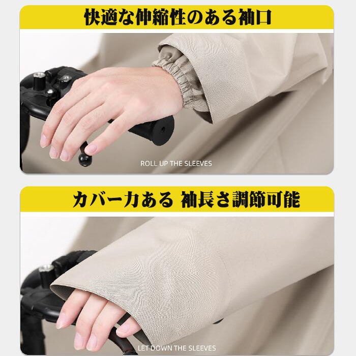 【雨の日にも安心安全】。ポンチョだけど、袖もあります。両手の自由が利く,袖がある ので、ハンドル操作がしやすい。ロング丈で足元がすっぽり隠れて濡れにくい 。